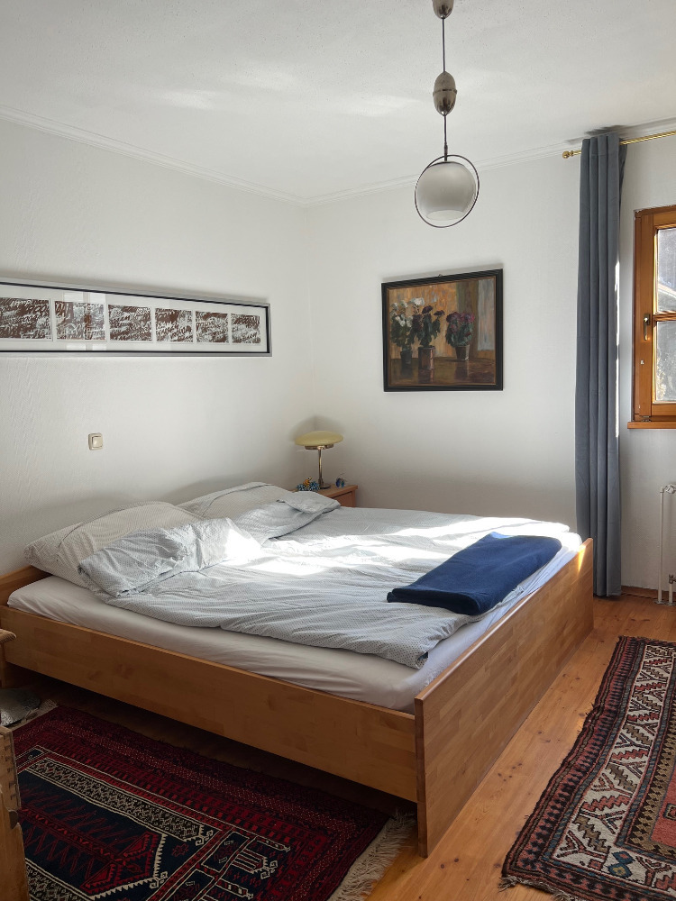 Rund ums Haus gibt es viele Plätze zum Verweilen: eine große Terrasse, die alles miteinander verbindet, mehrere kleine Sitzecken, Liegen zum Zurücklehnen – und mittendrin ein Garten, der einfach zum Rasten einlädt. Ob mit einem Buch, barfuß im Gras oder beim Blick in den Himmel: Hier draußen darf alles langsamer werden. Im Kirschzimmer führt ein kleiner Balkon direkt ins Grüne – ideal für den ersten Kaffee am Morgen oder ein stilles Gespräch am Abend.